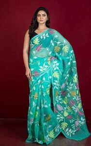 - Premium Bengal Silk: Crafted from premium-quality silk, this saree exudes luxury with its soft texture and elegant sheen, perfect for special occasions.