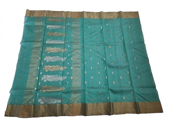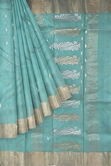 HerClozet is famous for its hand-woven sarees, is a renowned centre for it’s traditional weavers. Chanderi sarees have unmatched sophistication and are popular among the Indian upper middle class saree wearers. The traditional weaving of Chanderi fabric is mainly done for making sarees and suit materials. Chanderi fabric is known for its sheer texture, light weight and a glossy transparency.This is Sea Green Traditional Chanderi Katan silk saree with silver golden zari boota weaved all over and golden zari border . This saree is very light weight and easy to drape. Blouse is attached in the saree, saree length is 6.3 Mtr.
