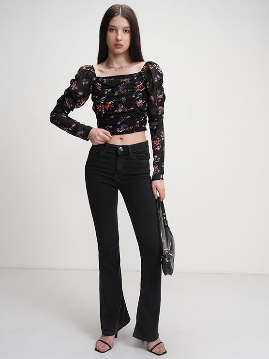 - 📝🛍️ Product Description: A chic black crop top with a vibrant pink floral print, featuring delicate ruched detailing at the front for a flattering silhouette. The fitted design enhances the shape, while the cropped length adds a trendy touch.